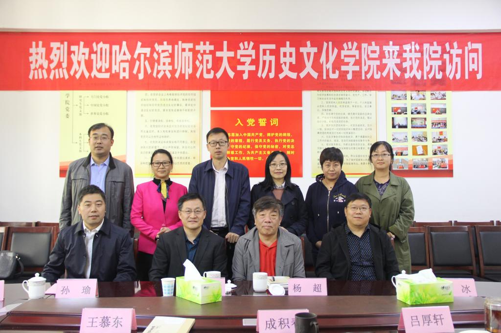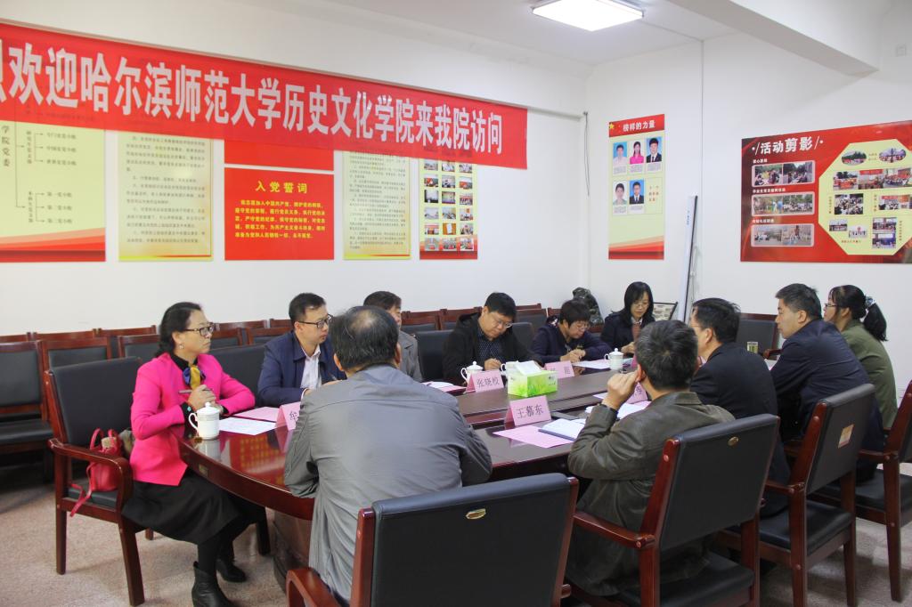 10月19日上午,哈尔滨师范大学快猫视频 副院长杨超,《北方论丛》原主编、教授张晓校,历史系主任孙瑜,副主任吴玲,旅游系主任牟维珍,文保专业负责人王冰来我校访问交流。快猫视频 院长成积春、党委副书记王慕东、副院长吕厚轩、团委书记王建阳、世界史教研室主任邹翔出席会议。