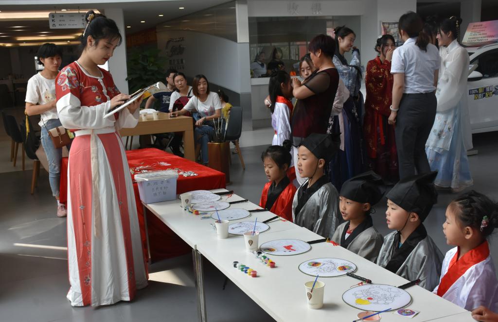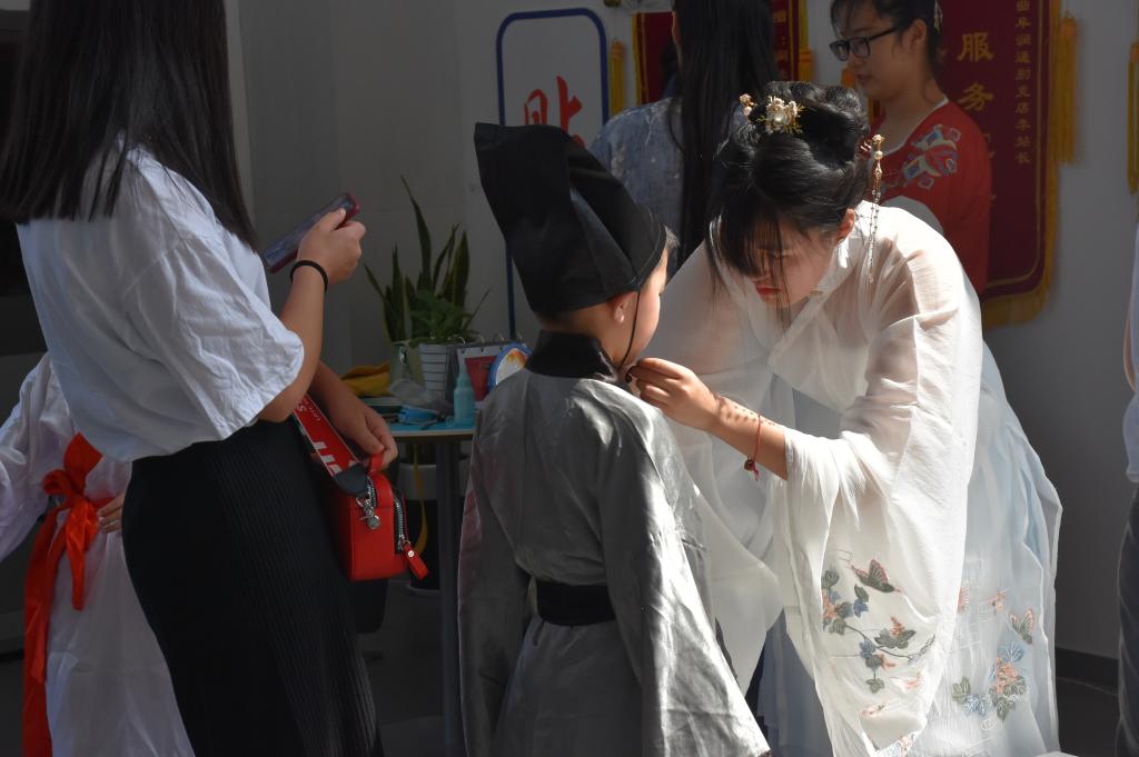 6月2日上午,快猫视频 洙泗学社走出校园,去到润华别克曲阜店为小朋友们开设了一堂妙趣横生的儒学课堂。洙泗学社抓住儿童节的“尾巴”,为小朋友们教授了精彩的儒学文化知识。在课堂上,小朋友们体验了有趣的穿汉服、梳发髻、跟读论语、画团扇、写书法和投壶游戏。