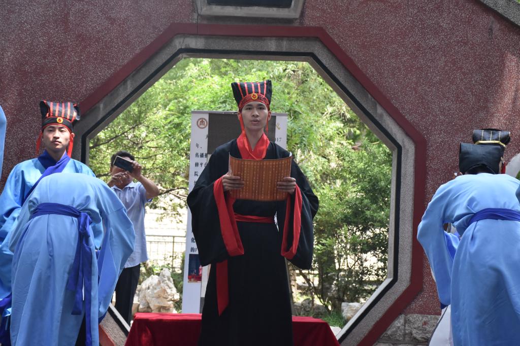 6月4日上午,快猫视频 传统礼仪研修中心在萃华园为来我校学习访问的金砖五国留学生展演束脩礼。