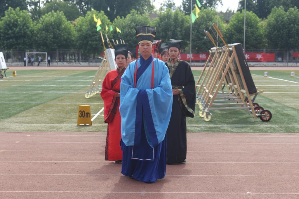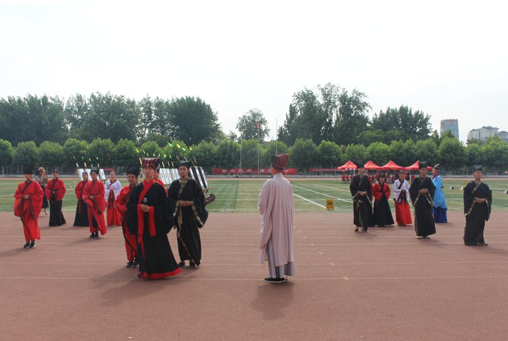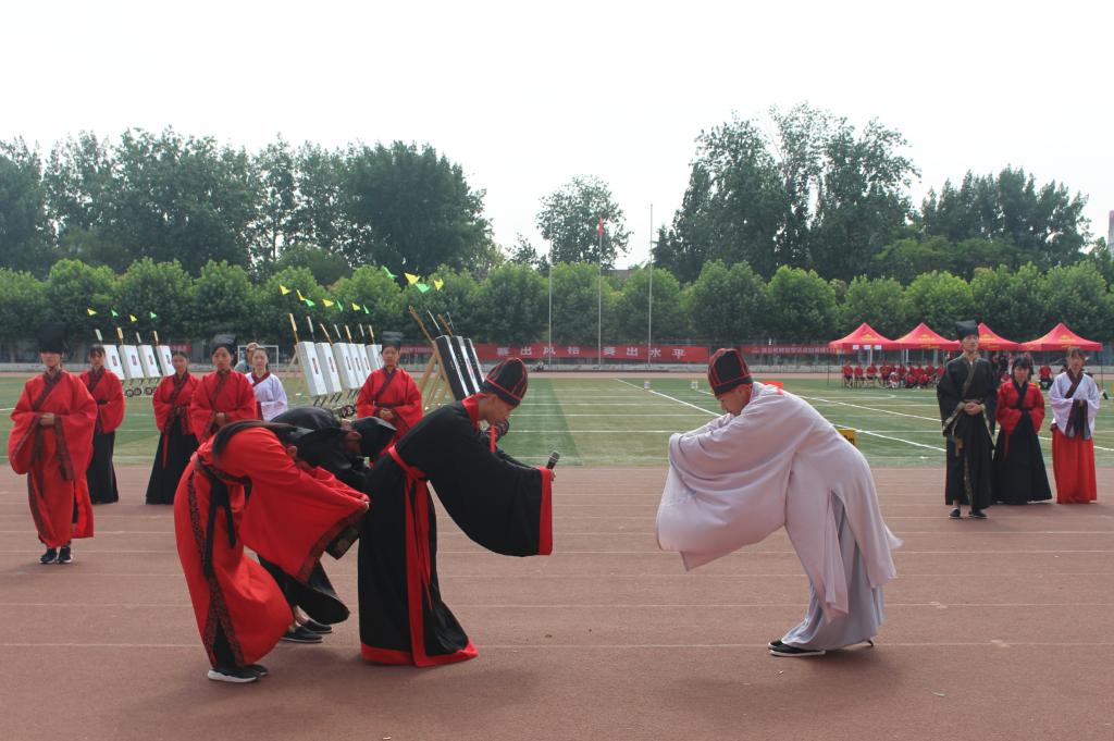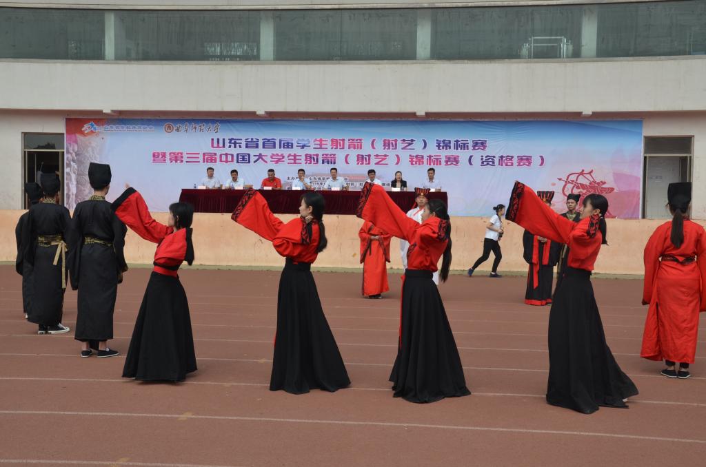 6月22日上午,快猫视频 传统礼仪队在南操场为第三届中国大学生射箭(射艺)资格赛暨山东省首届学生射箭(射艺)邀请赛举行迎宾礼开场展演。