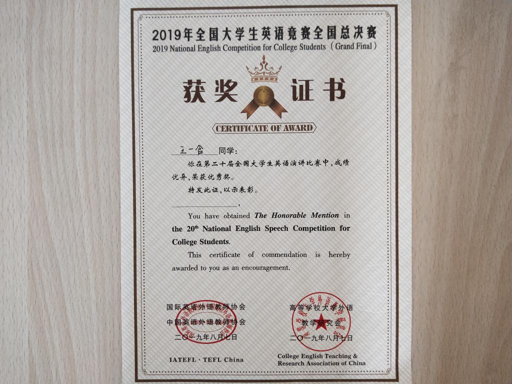 8月2日至8月8日,2019年全国大学生英语竞赛(NECCS)全国总决赛在长春光华学院顺利举行。快猫视频 学子王一含在本次比赛中取得2019年全国大学生英语演讲比赛优秀奖以及全国大学生英语竞赛( NECCS )C类特等奖的优异成绩。