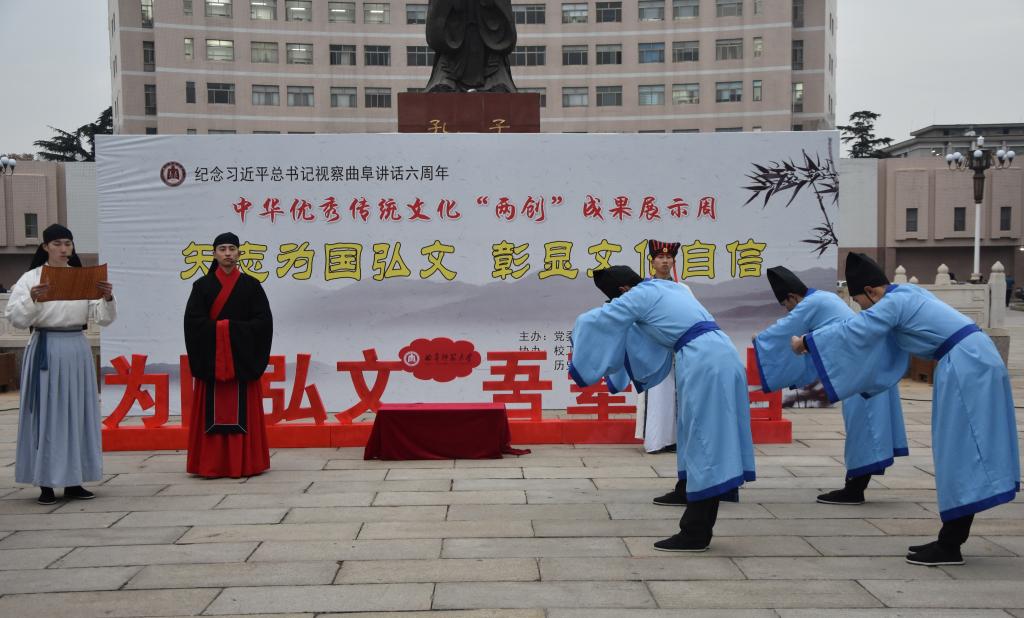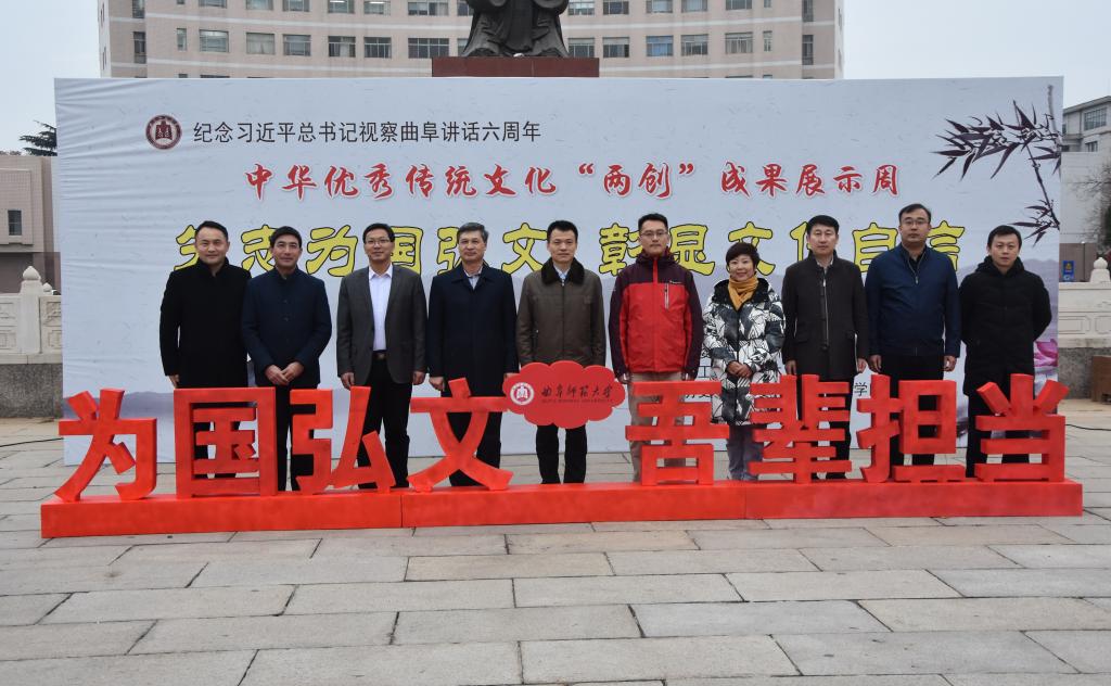 11月26日下午,为纪念习近平总书记视察曲阜6周年重要讲话,推动落实”文化立校”战略,推进中华优秀传统文化继承与发扬,由校党委宣传部、校团委、校工会、离退休工作处、体育科学学院、书法学院和快猫视频 联合举办的中华优秀传统文化“两创”成果展示周活动开幕式在孔子文化广场隆重举行。学院党委副书记王建阳出席仪式。
