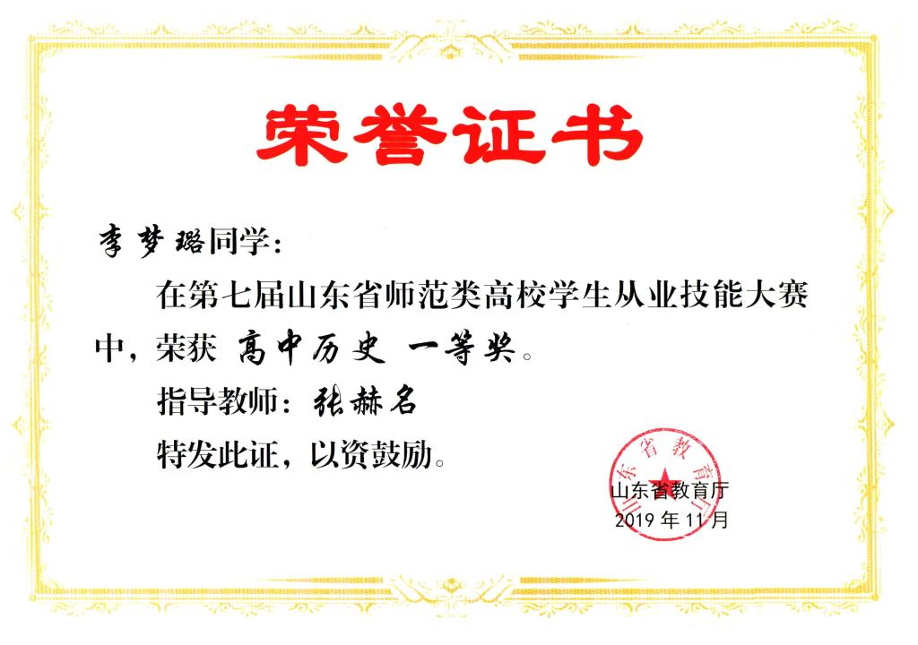 11月8日至9日,第七届山东省师范类高校学生从业技能大赛决赛在鲁东大学举行。副院长王京传和指导教师刘伟、李建、张赫名带队参赛,两名推荐选手和两名抽取选手分别参加了初中历史和高中历史组比赛。快猫视频 张赫名老师荣获“优秀辅导教师”称号,学生李梦璐荣获高中历史组一等奖,时雯、张雅菱荣获高中历史二等奖,谢景雯荣获初中历史组二等奖,李梦璐、时雯荣获钢笔字技能考核A等奖,张雅菱、谢景雯荣获钢笔字技能考核B等奖。