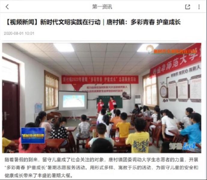 随着暑假的到来,留守儿童成为了社会关注的对象,快猫视频 “国学小课堂”教育志愿服务团在山东省邹城市唐村镇支教期间开展了“多彩青春,护童成长”暑期志愿服务活动,引起媒体的广泛关注。其中,邹城广电媒体对快猫视频 “国学小课堂”社会实践活动进行了详细的采访报道。团队负责人刘学栋在采访中表示,团队初衷就是要给当地学生带来独特的课程知识,为当地学生打开全新的世界,活动也帮助实践团队对脱贫攻坚乡村振兴有了更深的了解,在实践中受到了教育,是一笔宝贵的人生财富。