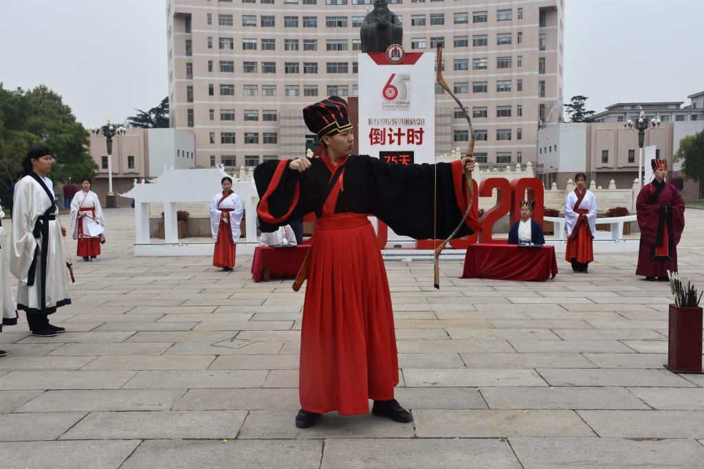 随着咸和之乐缓缓奏起,学生代表和教师身着汉服一起进行祭孔仪式的展演,在悠扬的钟鼓声中向孔子像行启户、辞训、献礼、饮福受胙之礼。教师代表向孔子像敬献花篮,并进行发言。随后,传统礼仪队队员严格按照理论仪程进行了包括迎宾、献宾、命司正等的射礼展演。展演结束后,老师们体验了射箭和投壶等特色传统礼仪活动,切身感受射礼中蕴含的“发而不中,反求诸己”的道德自省精神。