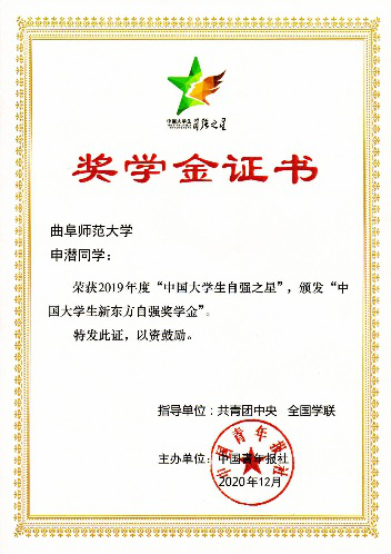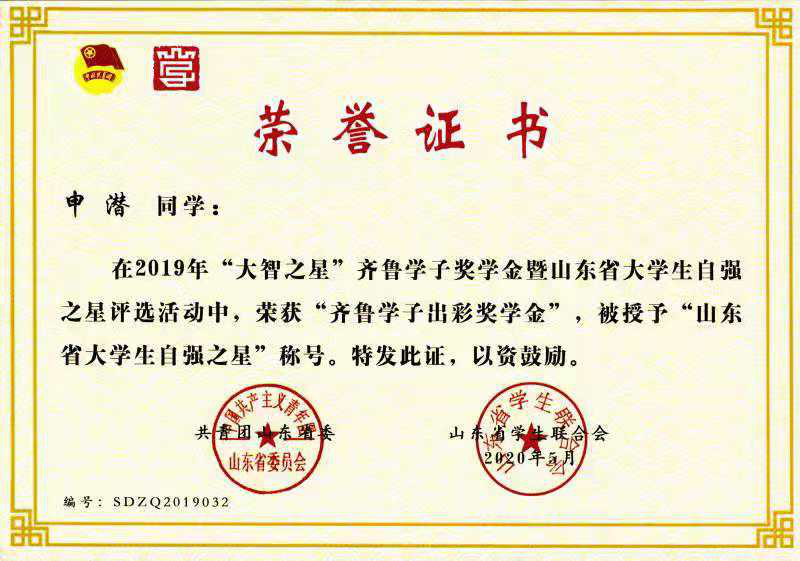 近日,2019年度“中国大学生自强之星”名单揭晓,经学校推荐、省级初评、全国评审等环节,快猫视频 申潜同学脱颖而出,先后获评“山东省大学生自强之星”、“中国大学生自强之星”。