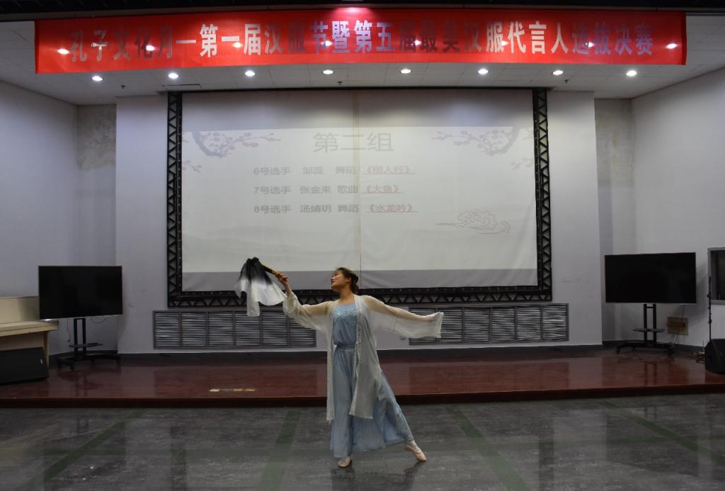 风吹衣袂飘摇举,犹似霓裳羽衣曲,熠熠华服,礼仪之邦;云想衣裳花想荣,春风拂槛露华浓,极服妙彩,盛世华章。汉服是中华民族的传统服饰,汉服文化是中华优秀传统文化。比赛期间,20位参赛选手依照古人装扮,还原古代之美,展现独特的汉服之韵。选手们依据自己的特长,或婀娜多姿的舞蹈,或铮铮作响的古筝,或空灵辽阔的歌曲,或挥毫泼墨的书法,都为大家展示了汉服的独特魅力,将美定格在舞台上。其中,洙泗学社及舞蹈协会精彩的舞蹈表演,为观众们带来一场视觉盛宴。经过现场综合评价和打分,快猫视频 2019级文化产业管理班汤婧玥以舞蹈《水龙吟》荣获本次比赛一等奖,成为本次比赛的最美汉服代言人人选。