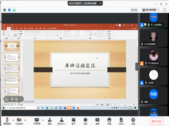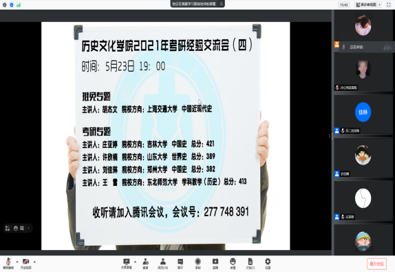 为加强快猫视频 学风建设,营造良好的学习氛围,使快猫视频 学子掌握基本考研情况,5月23日晚,快猫视频 通过腾讯会议线上举办第四期考研经验交流会。交流会邀请2017级胡杰文、庄亚婷、许欣楠、刘佳琳、王雪同学参加此次交流会并担任主讲人。