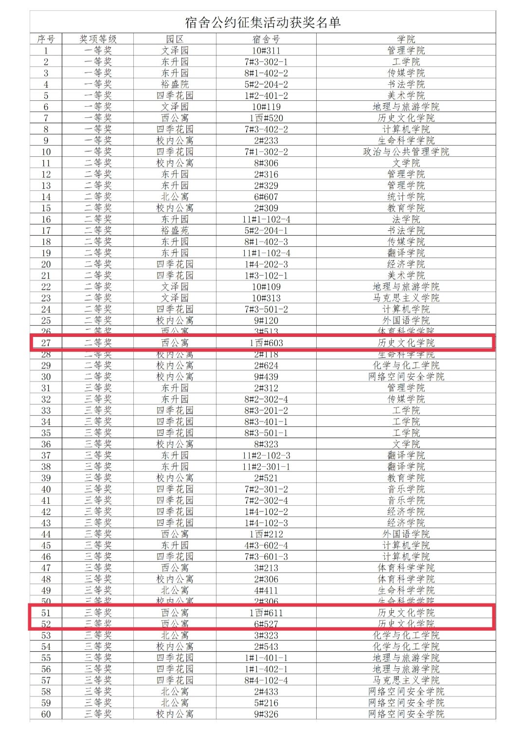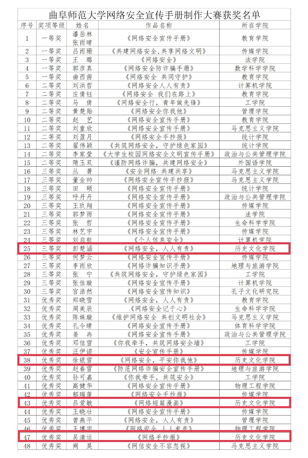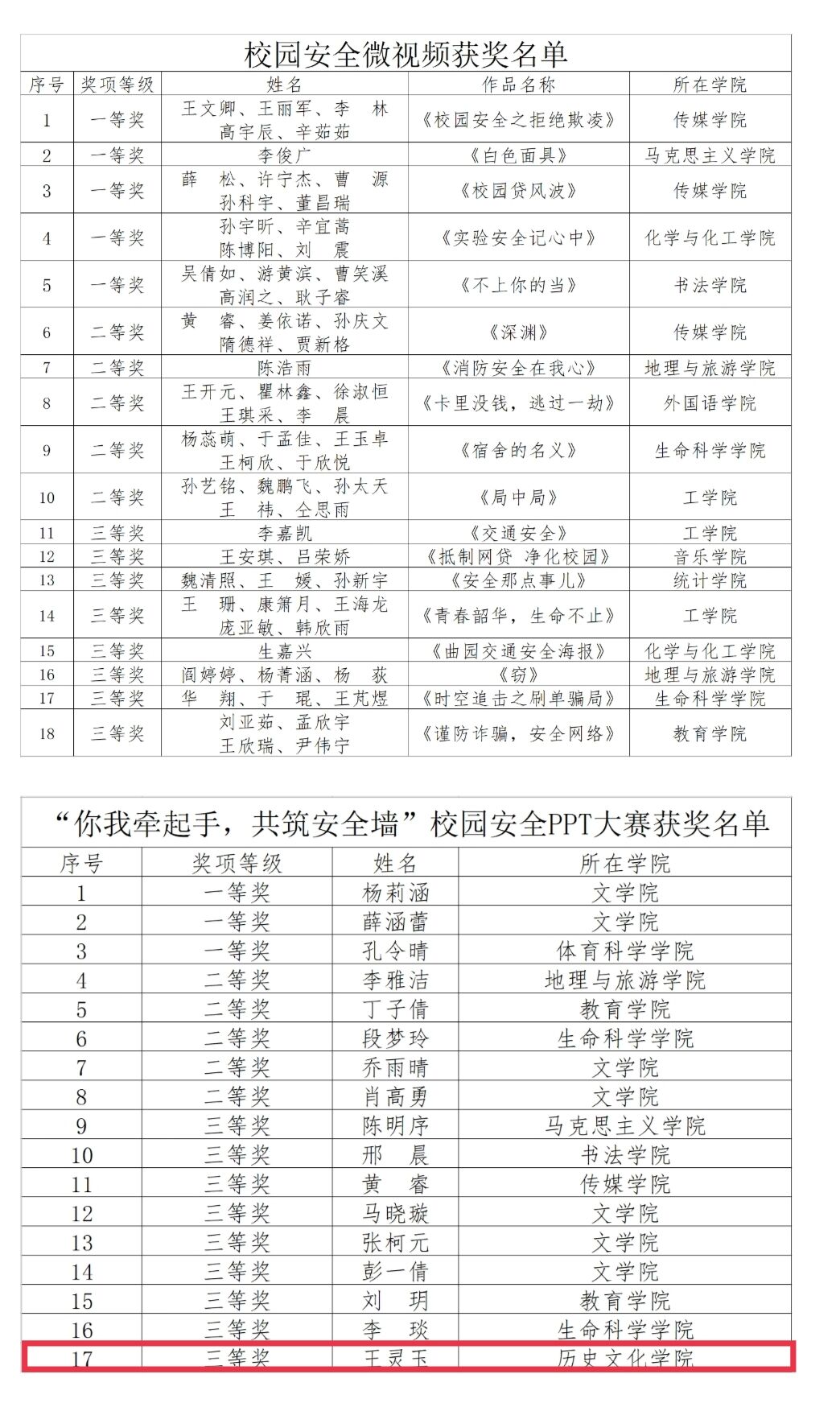 其中,在宿舍公约征集活动中,快猫视频 西公寓一号楼西603宿舍荣获二等奖,西公寓一号楼西611宿舍、西公寓六号楼527宿舍荣获三等奖;在网络安全宣传手册制作大赛中,快猫视频 彭楚涵同学荣获三等奖,徐银雪、吕爱敏、吴清运同学荣获优秀奖;在“你我牵起手,共筑安全墙”校园安全PPT大赛中,快猫视频 王灵玉同学荣获三等奖。