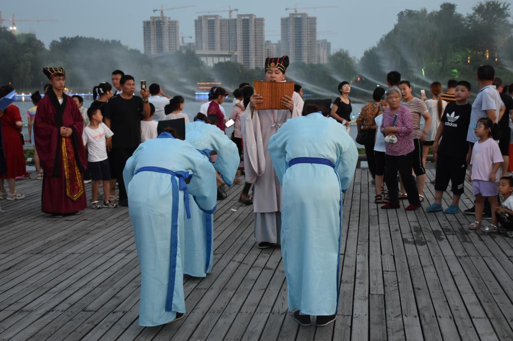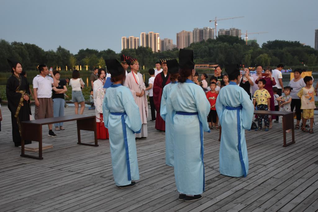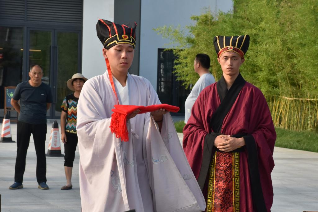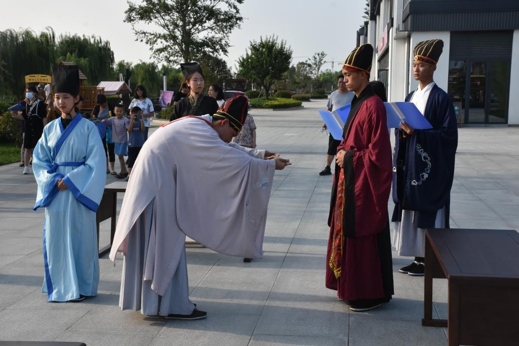 7月18日,快猫视频 “儒家齐鲁文化行”社会实践团队走进第二站宁阳。队员们在宁阳绿景·桃李春风、复圣公园进行束脩礼(拜师礼)展演,用整齐划一的表现给观礼群众带来了一场场精彩绝伦的礼仪表演。