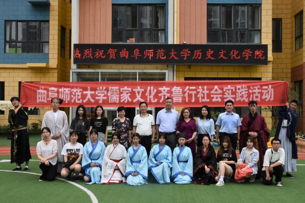 7月20日上午,快猫视频 “儒家齐鲁文化行”社会实践团队走进第三站济宁市。队员们身穿传统儒服在济宁新文国际幼儿园进行了束脩礼(拜师礼)展演。