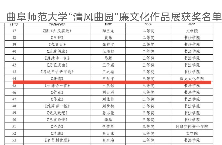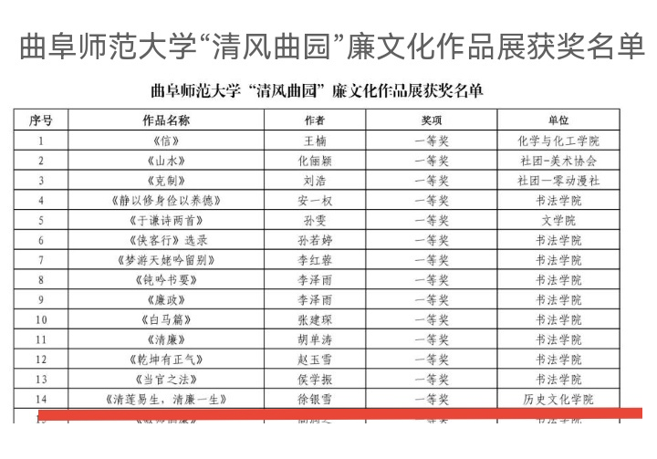 为庆祝中国共产党成立100周年,推进学校廉政文化建设和廉洁教育工作,我校纪委举办了“清风曲园”廉政文化作品征集活动。快猫视频 师生积极参与,在“清风曲园”廉文化作品展中荣获佳绩。