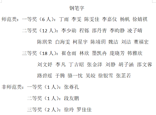 大赛面向2019级、2020级学生,分为师范生和非师范生两个组别,共设置钢笔字、毛笔字、粉笔字三个专项。比赛中,各位参赛同学个个精神专注,书写风格鲜明,钢笔字姿态横生,毛笔字行云流水,粉笔字清晰工整,展现出了自己的最高水平。最后,各位评委老师经过认真讨论,仔细评分,从各组参赛选手中分别选出师范生前五名、非师范生前三名,推荐参加学校比赛。