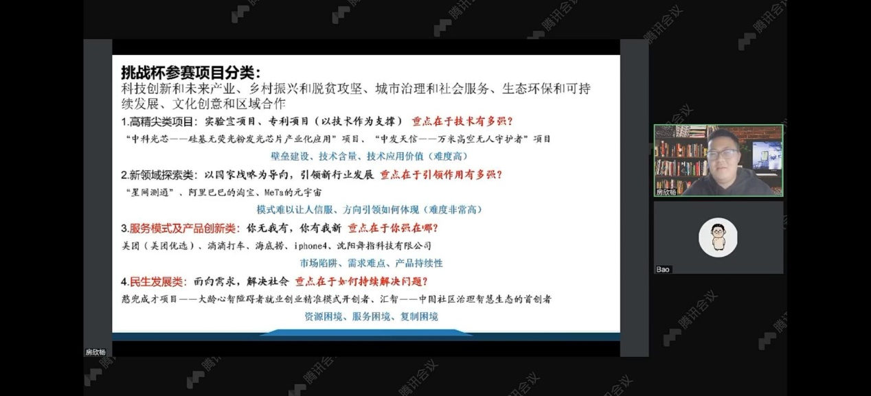 为提高大学生创新创业参赛能力,进一步增强学生们对“挑战杯”的认识,11月14日晚,快猫视频 组织观看2021年“挑战杯”创业计划竞赛培训第二期。新疆大学社会工作研究生房欣杨为主讲人,快猫视频 2020级、2021级学生积极报名参加,观看培训会议。