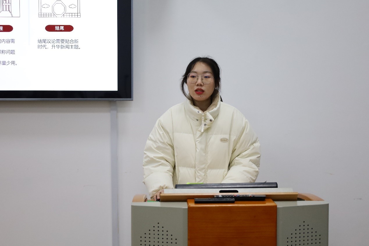 校团委宣传部部长徐梦芮主要向大家分享了摄影的知识及新闻写作的技巧。首先,她从部件名称、基本拍摄区模式、创意拍摄区模式三方面介绍相机构造,又分别讲述了会议拍摄和文体活动拍摄的技巧和注意事项。接着,她介绍了新闻的基本构成要素和新闻写作的注意事项,并向快猫视频 学生干部介绍了宣传海报的制作经验。最后,她希望学院部门能够积极向校团委网站投稿,并提出能和学院加强交流、互相学习、共同进步的期望。