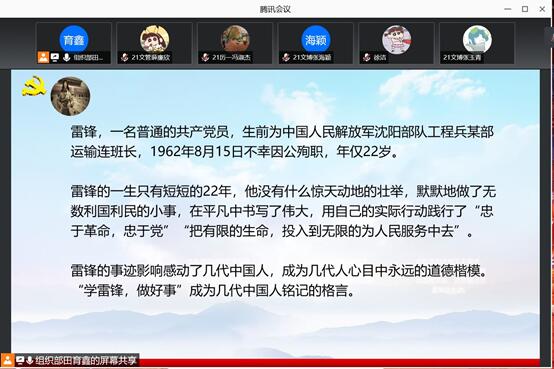 为贯彻落实习近平新时代中国特色社会主义思想,积极培养和践行社会主义核心价值观,传承中华民族传统美德,进一步弘扬雷锋精神,3月13日晚上,快猫视频 组织部通过腾讯会议举行线上学习雷锋精神主题会议。