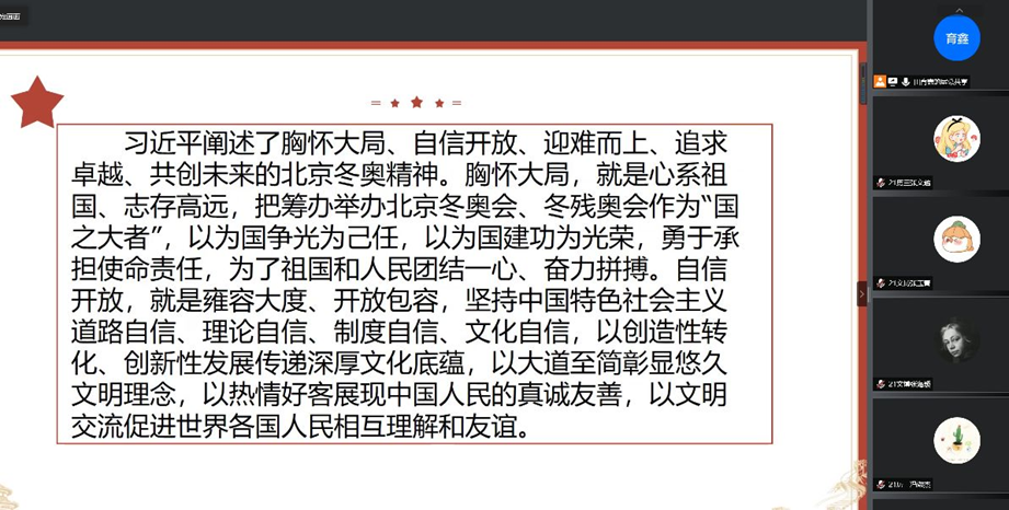 本次会议以北京冬奥会、冬残奥会总结表彰大会上习近平总书记发表重要讲话为背景,讲述北京冬奥会、冬残奥会广大参与者珍惜伟大时代赋予的机遇,在冬奥申办、筹办、举办的过程中,共同创造了胸怀大局、自信开放、迎难而上、追求卓越、共创未来的北京冬奥精神。冬奥精神使同学们倍受鼓舞,纷纷表示在未来的学习生活中将弘扬冬奥精神,严格要求自己,做冬奥精神的传承人和发扬人。