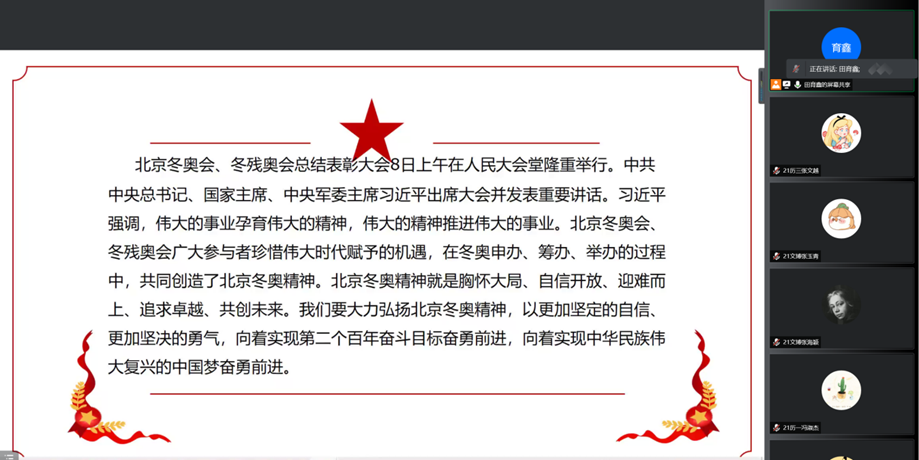 4月19日,快猫视频 团委理论学习中心组展开线上第二次理论学习,传递北京冬奥精神。理论中心组全体成员参加会议,组织部部长田育鑫担任主讲人。