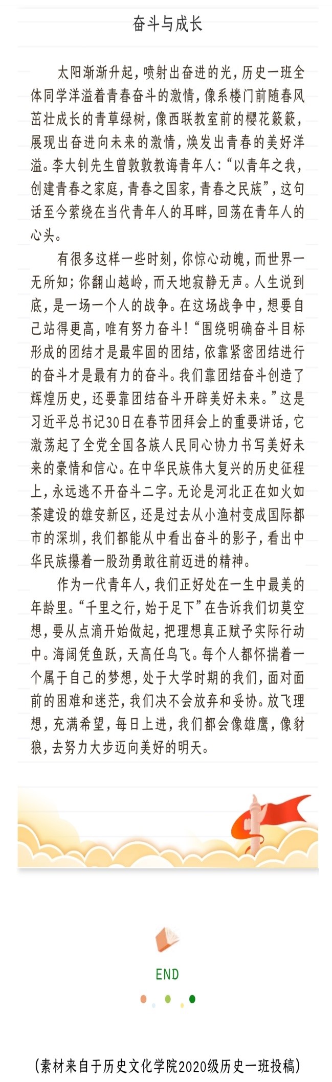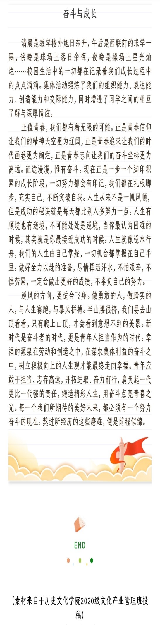 为学习和弘扬奋斗精神,近日,中国青年网组织开展了2022年“奋斗与成长”大学班级创意微文征集活动,面向广大高校学生征集以“奋斗与成长”为主题的微信文章。快猫视频 学子积极参与征集活动,踊跃投稿。