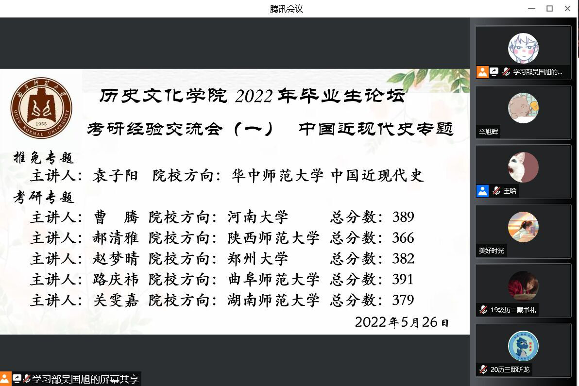 为加强快猫视频 学风建设,提高快猫视频 学生考研热情,帮助快猫视频 学子深入了解考研流程,掌握相关考研技巧,5月26日,快猫视频 于腾讯会议线上成功举办考研经验交流会。交流会诚邀2018级路庆祎、曹腾、郝清雅、赵梦晴、关雯嘉、袁子阳六位同学参加并担任主讲人,会议由2018级王晗同学主持。