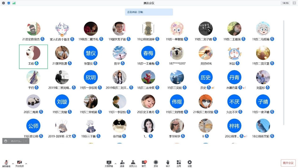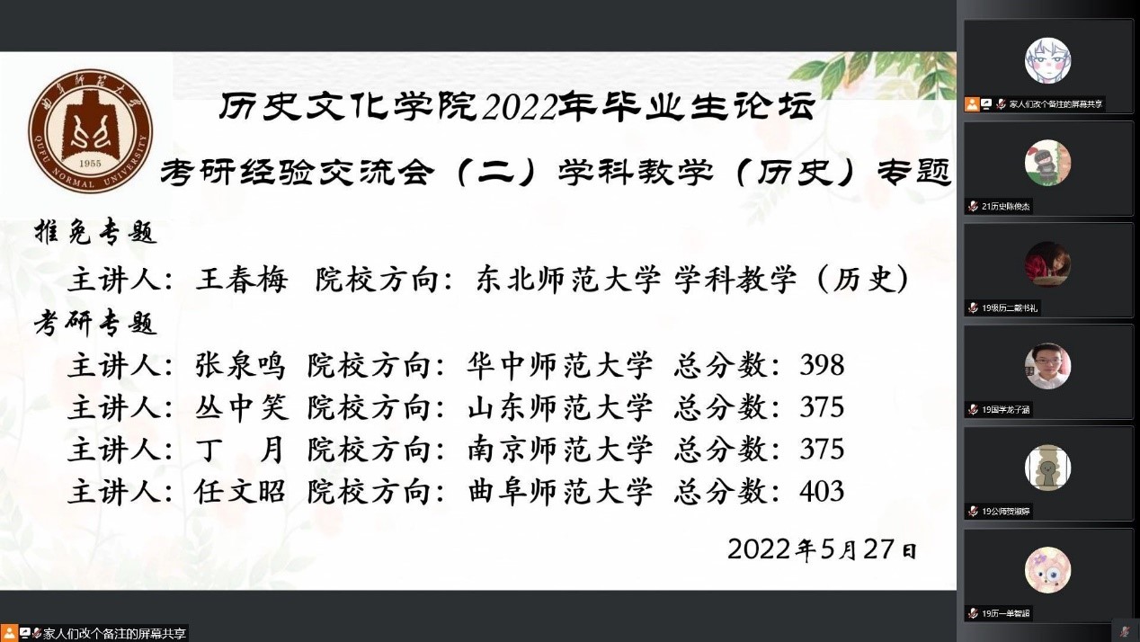为解决考研学子的备考问题,激发同学们学习热情和考研激情,增强同学们考研的信心和决心,5月27日,快猫视频 成功举办考研经验交流会(二)——学科教学(历史)专题。本次交流会以线上形式进行,邀请2018级考研成绩优异的王春梅、张泉鸣、丛中笑、丁月、任文昭五位同学参加并担任主讲人,2018级王晗同学担任会议主持人。