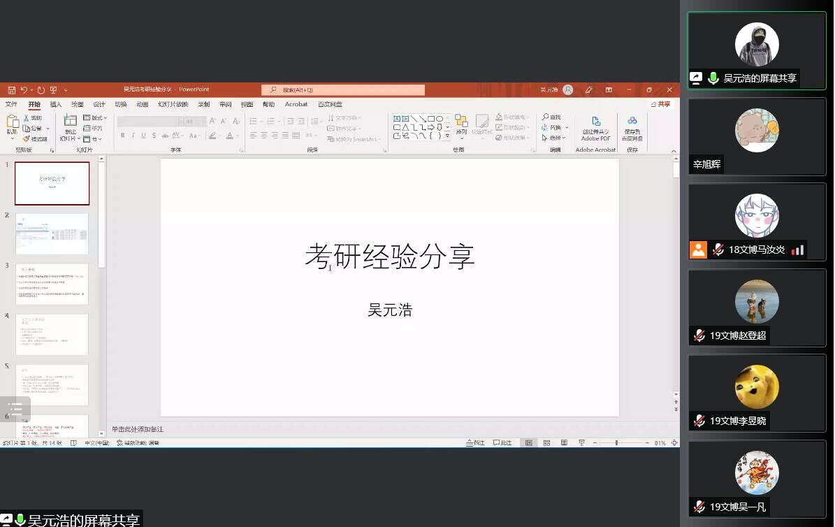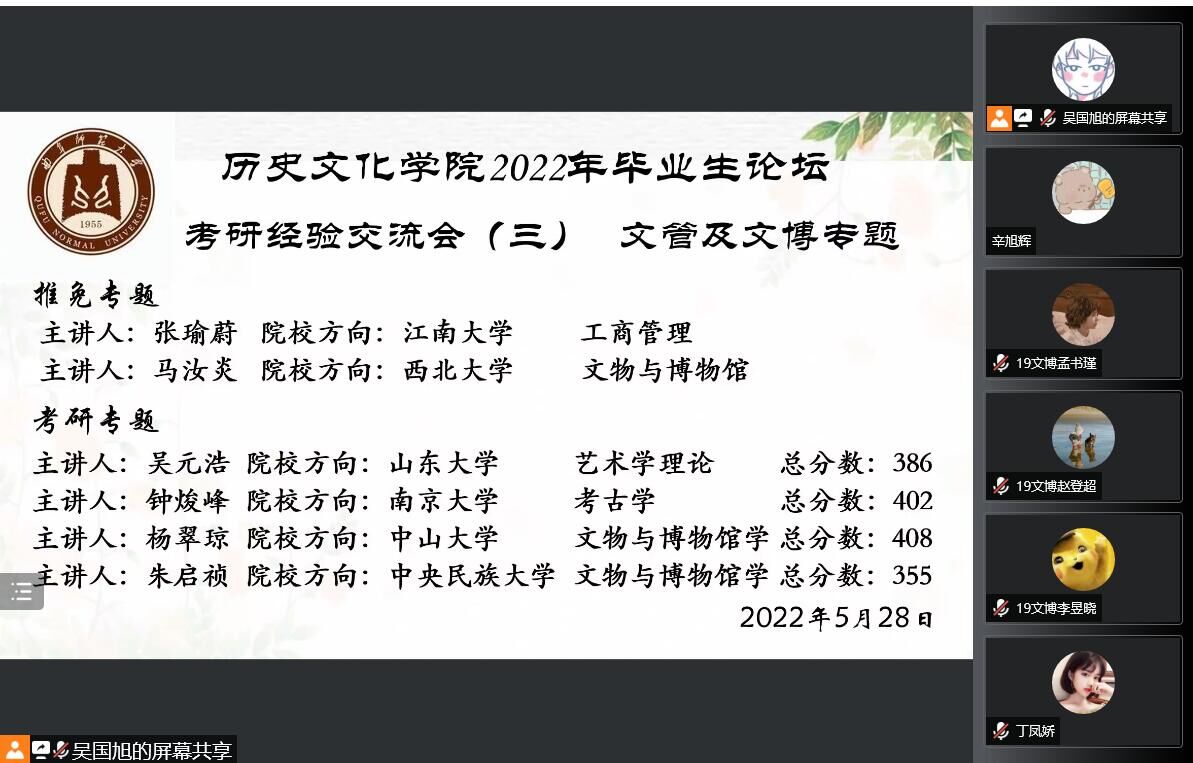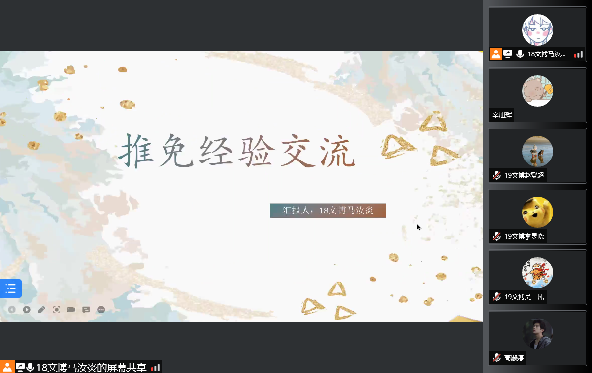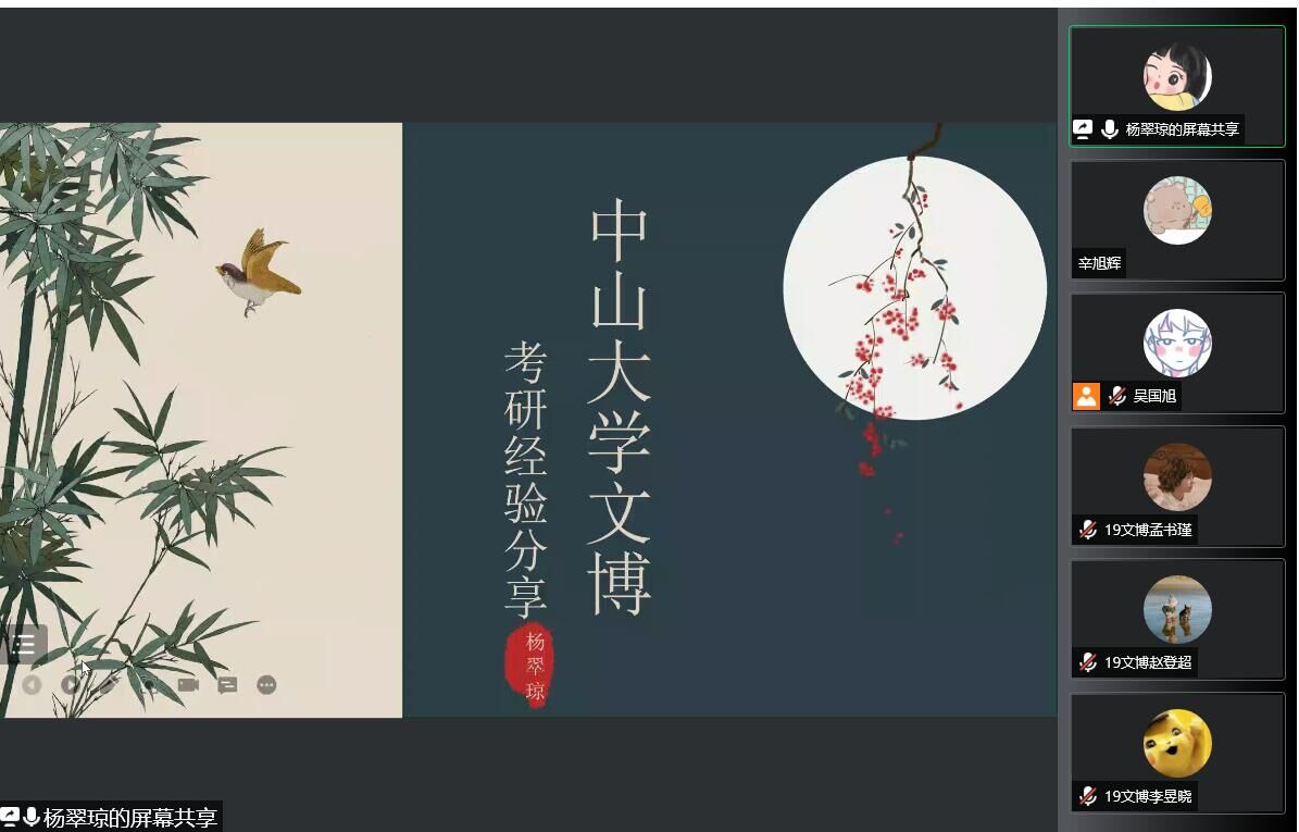 为帮助快猫视频 学子了解推免、考研形势,掌握相关考研技巧,增强快猫视频 学子考研信心,5月29日晚,快猫视频 于腾讯会议线上举办第三期考研经验交流会——文管及文博专题。交流会邀请2018级杨翠琼、张瑜蔚、吴元浩、钟焌峰、马汝炎、朱启祯六名同学参加并担任主讲人,会议由2018级王晗同学主持。