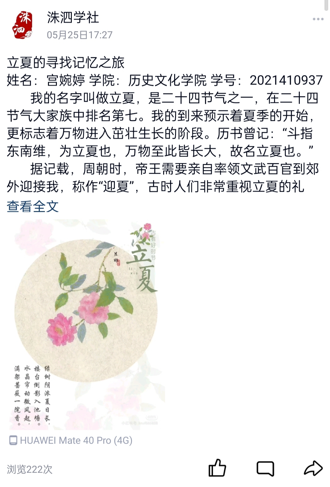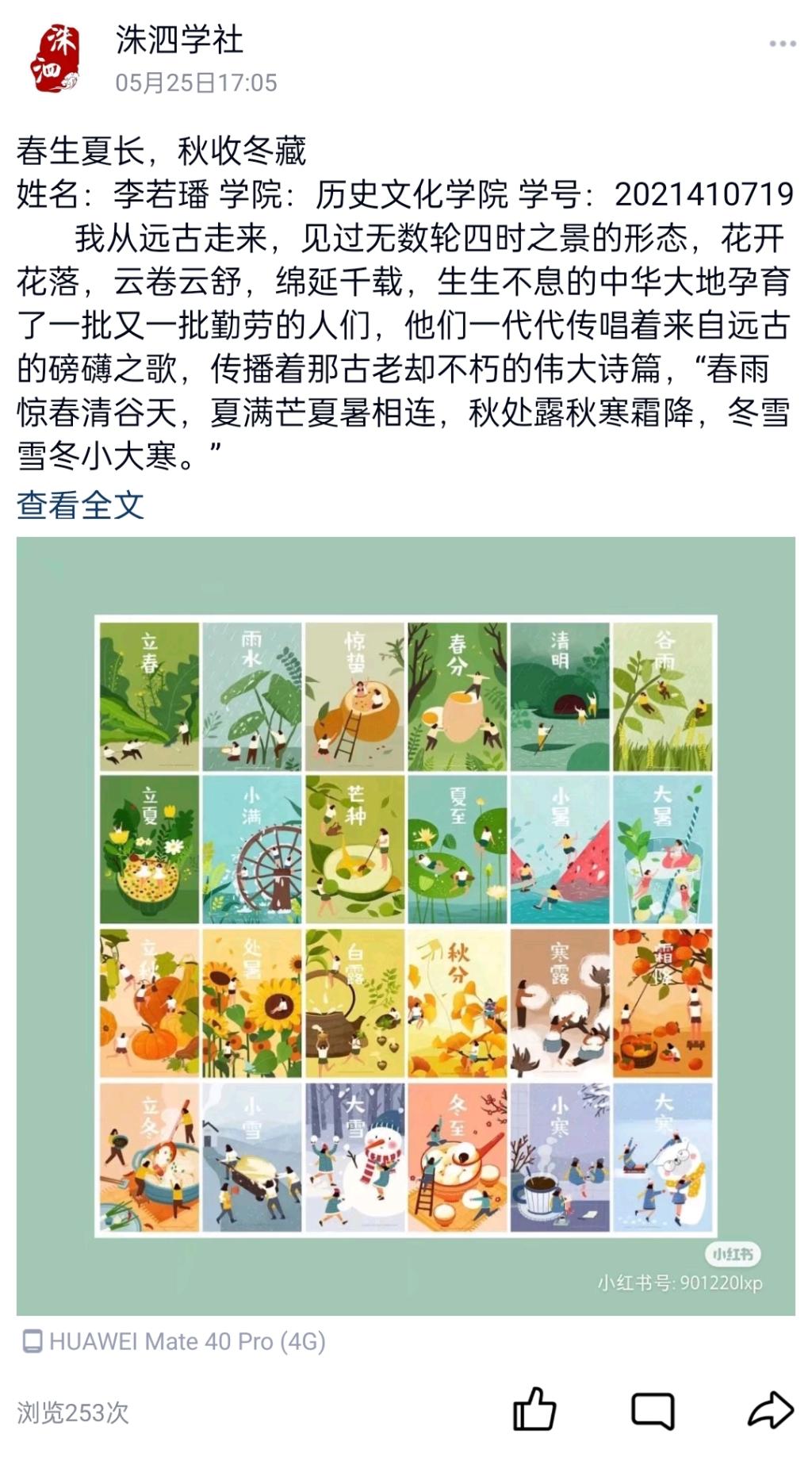 为了加深同学们对“二十四节气”的兴趣,了解中华传统文化,5月1日,快猫视频 洙泗学社成功举办了“二十四节气”征文比赛。