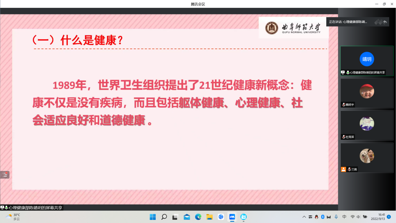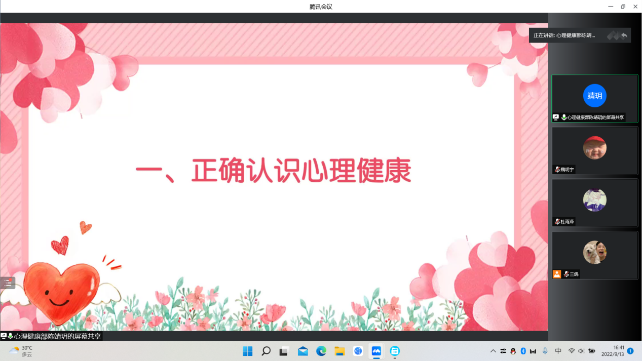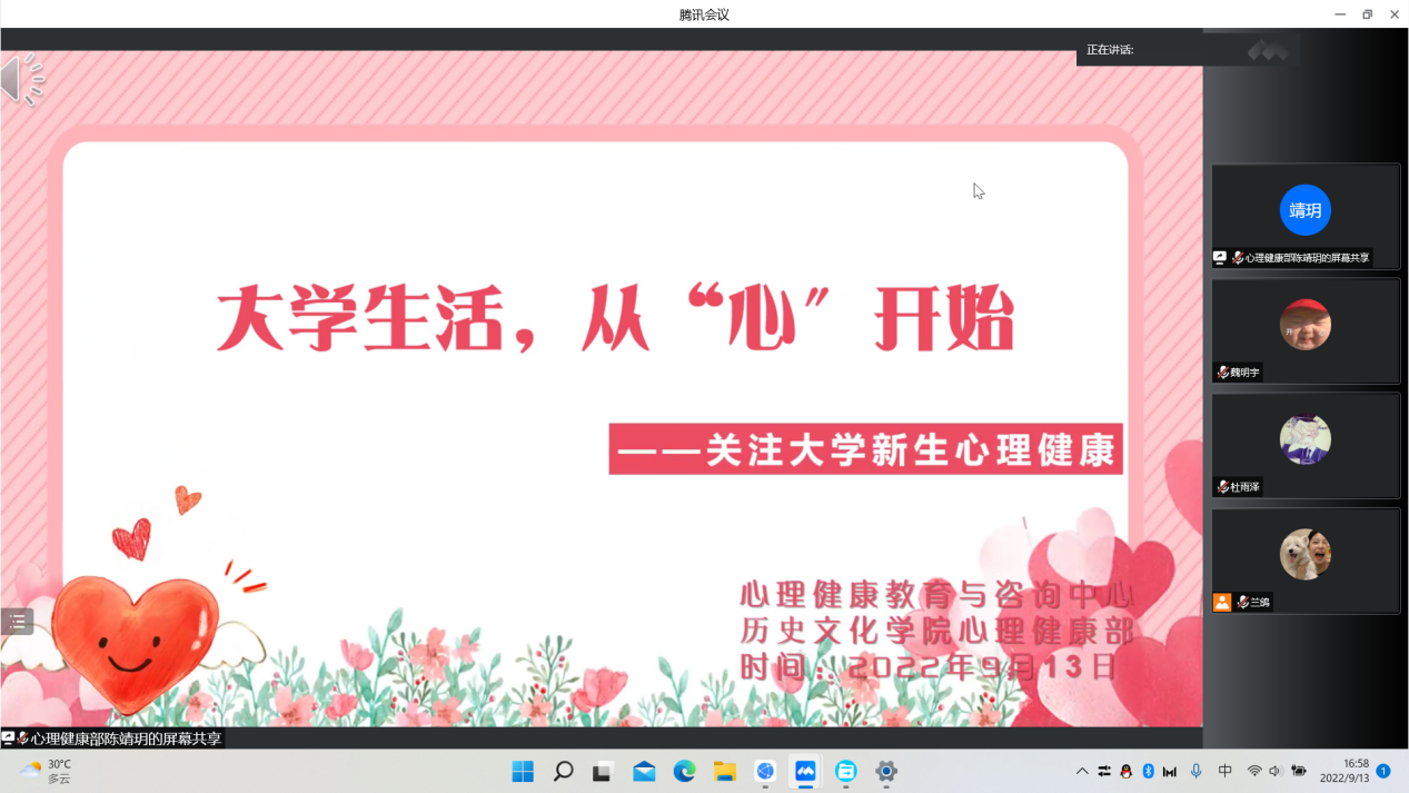 为引导新生培养理性平和健康的心态,9月13日下午,快猫视频 于线上开展心理健康主题班会。本次会议由快猫视频 心理健康部主持,快猫视频 22级新生参加。