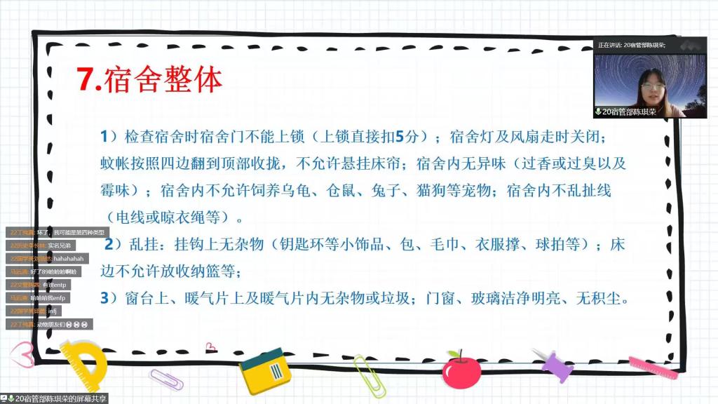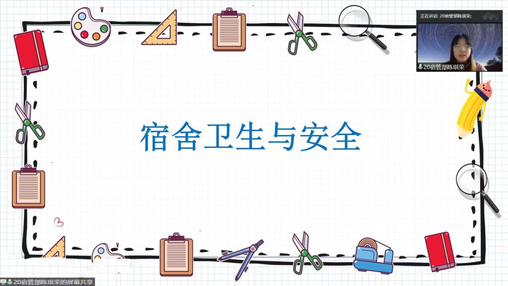 为推动新生宿舍的文明建设,创造整洁、文明、舒适、规范的生活环境,9月14日下午,快猫视频 于腾讯会议举办宿舍卫生与安全教育会议。宿管部陈琪荣担任主讲人,2022级全体新生参加会议。 会议上,陈琪荣就宿舍卫生检查标准和宿舍安全规范两部分进行详细讲解。在宿舍卫生检查方面,她向新生详细地介绍了宿舍打扫的技巧和检查标准,包括床底鞋子的摆放,床单被子的整洁,行李箱、脸盆、暖瓶的排列,阳台衣物的挂晾等。在宿舍安全规范方面,她重点强调了防火用电安全、违规电器检查及处罚、人身及财产安全保护和晚归检查四个方面。最后,陈琪荣对新生提出的问题给予了耐心的解答。