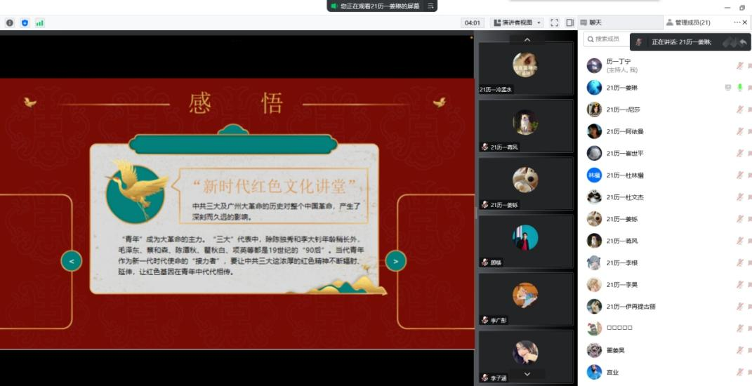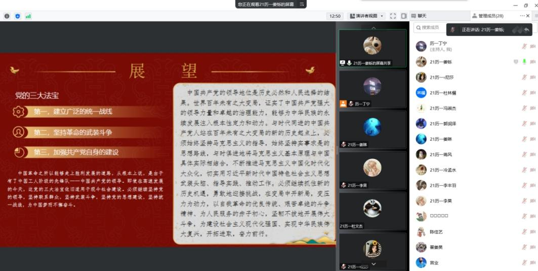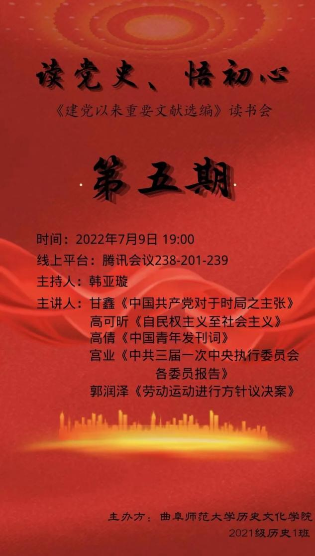百年党史,需要我们每个人传承和赓续。为加强对中国共产党丰富精神内涵的理解,树立崇高理想,自觉把个人命运同祖国命运紧密联系起来,快猫视频 于7月9日晚举办读党史、悟初心活动,本次读书会由张世慧老师指导,韩亚璇同学主持。