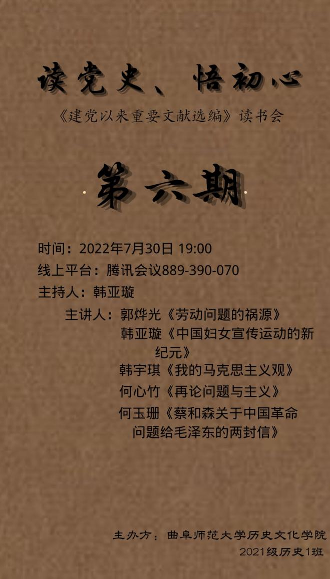 为充分认识劳动问题以及妇女解放运动的重大意义,认真了解劳动问题的祸源,全面准确把握妇女运动的时代意义以及现实影响,快猫视频 于7月30日晚举办读党史、悟初心读书会。本次读书会由张世慧老师指导,韩亚璇同学主持。