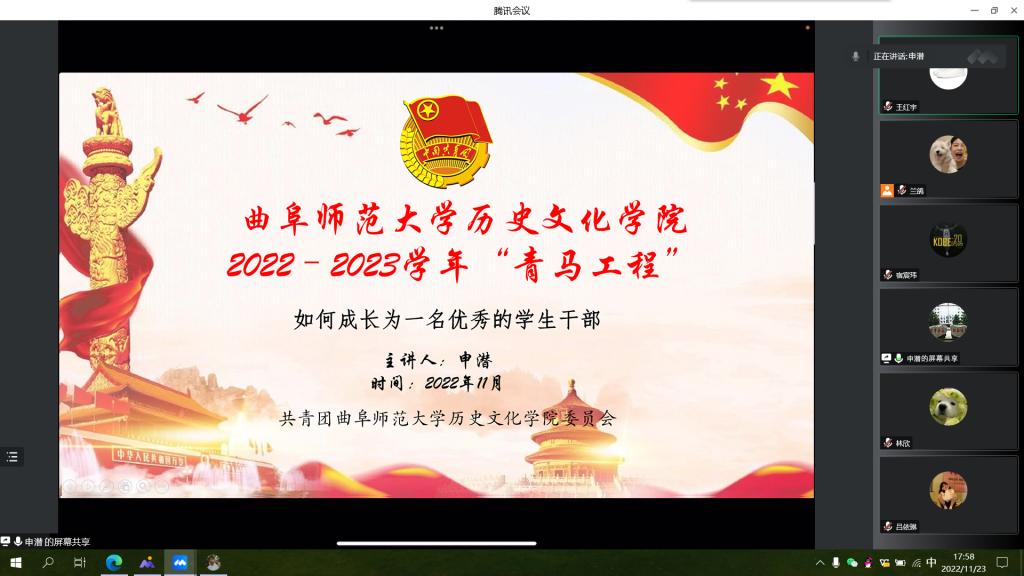 为促进新时代“青马”人对自身责任的认识,11月25日,快猫视频 开展了以“七年‘青马’经历谈新时代‘青马’人”为主题的线上青马工程讲座。本次会议特邀快猫视频 杰出校友申潜担任主讲人,快猫视频 所有青马工程班成员均参加会议。