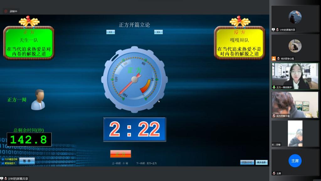 活动前期辩论社为参赛选手进行赛前培训,经过初赛、复赛的精彩角逐,最后由“天生一队”和“嘎嘎辩队”挺进决赛。辩论赛决赛,双方围绕“在当代追求热爱是否是对内卷的解脱之道”展开了激烈辩论。比赛共分为开篇立论、攻辩、自由辩论、开篇立论四个环节,双方引经据典、互不相让,凭借超强的逻辑能力将对决气氛推向高潮。最后,评委针对辩手表现进行精彩点评,使选手受益匪浅。