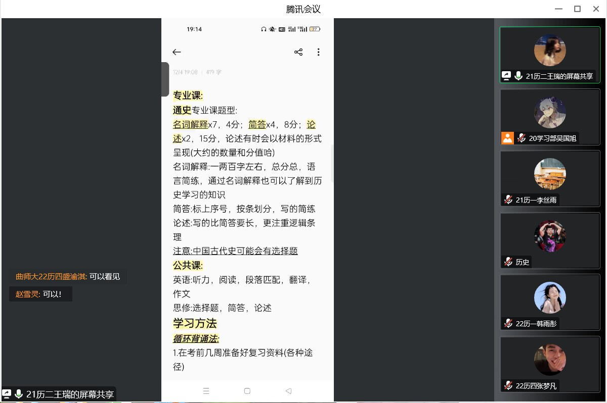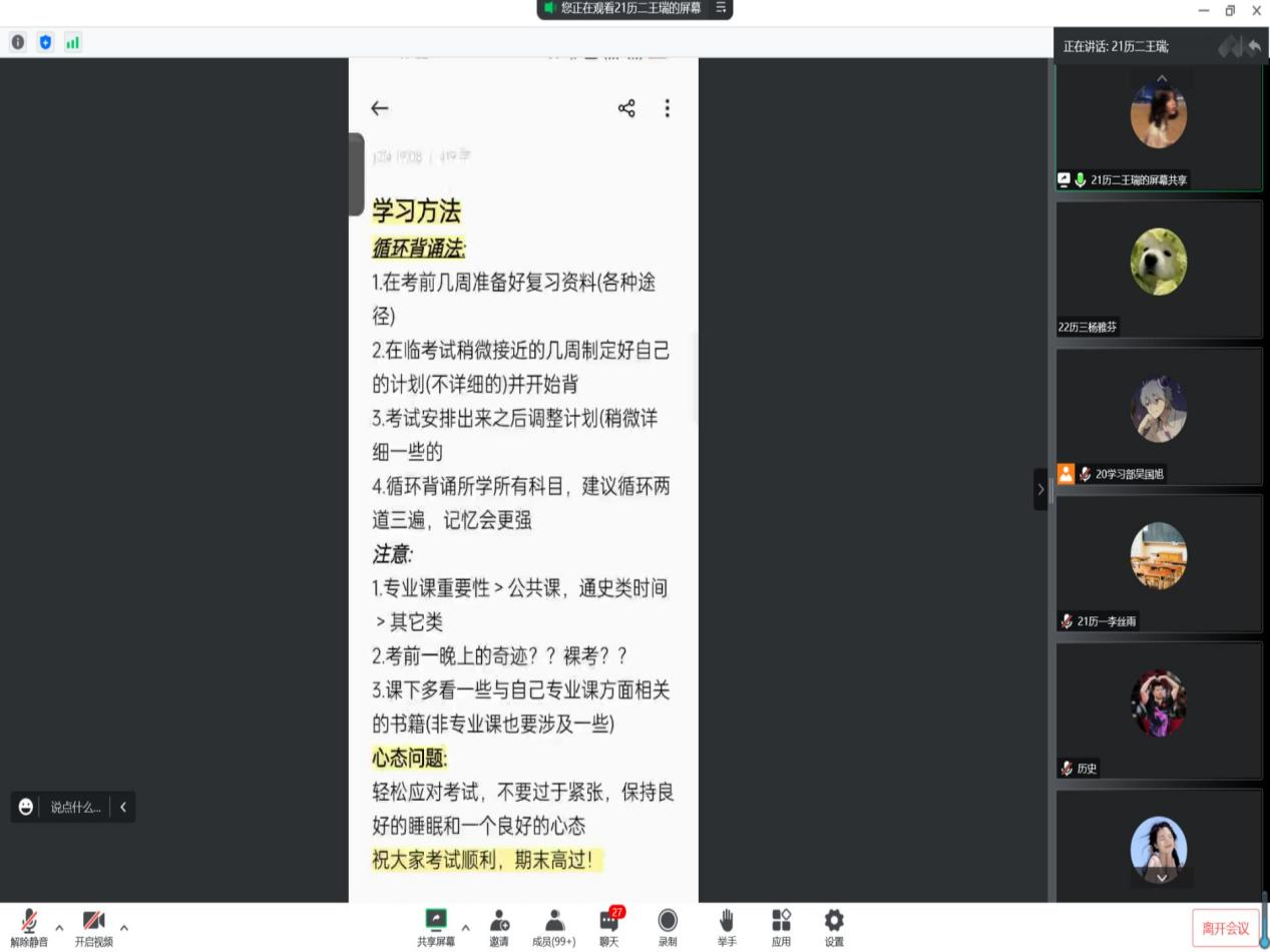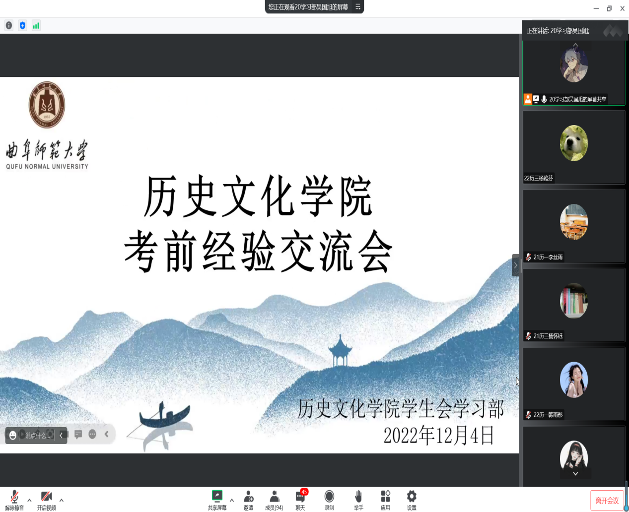 为帮助快猫视频 学子更快适应大学学习生活,加强同学们对考试问题的了解,掌握相关学习技巧,帮助同学们在考试中取得更好成绩,12月4日晚,快猫视频 于腾讯会议线上举办22级考前经验交流会。交流会邀请2021级国学、师范、文博、文管优秀学习代表参加并担任主讲人,分为四个会场,会议由学习部部长及副部主持,向2022级全体同学提供考试经验。