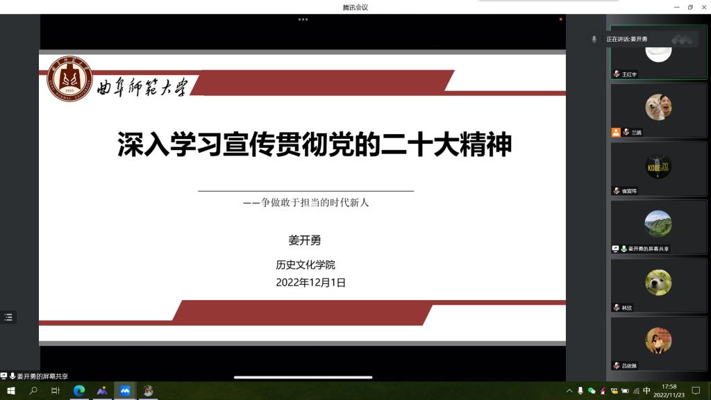 为深入学习宣传贯彻党的二十大精神,12月1日,快猫视频 党委书记姜开勇于线上给联系班级讲思政课。本次活动由团委书记刘贤贤主持、2021级公师班全体同学参加。