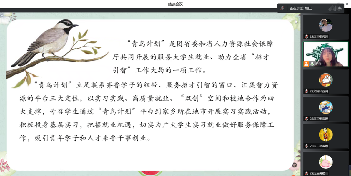 “青鸟计划”线上宣讲的成功举行,不仅提高了快猫视频 学子实操能力,为“青鸟计划”队伍注入了新鲜血液,丰富了在校生人生履历,还积极响应了学院号召,为快猫视频 精神文明建设的长远发展打下坚实基础。