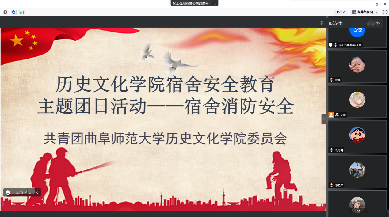 本次活动围绕宿舍消防安全教育主题,采用主题团日线上会议的形式对快猫视频 学生进行全面的教育宣传。会议中,主持人通过生动详实的PPT,讲解了宿舍的火灾隐患,着重强调了学生宿舍火灾预防措施以及遇到火灾的处理方式。在最后的答疑环节中,同学们积极互动,提出疑惑,主持人耐心解答,现场气氛活跃。
