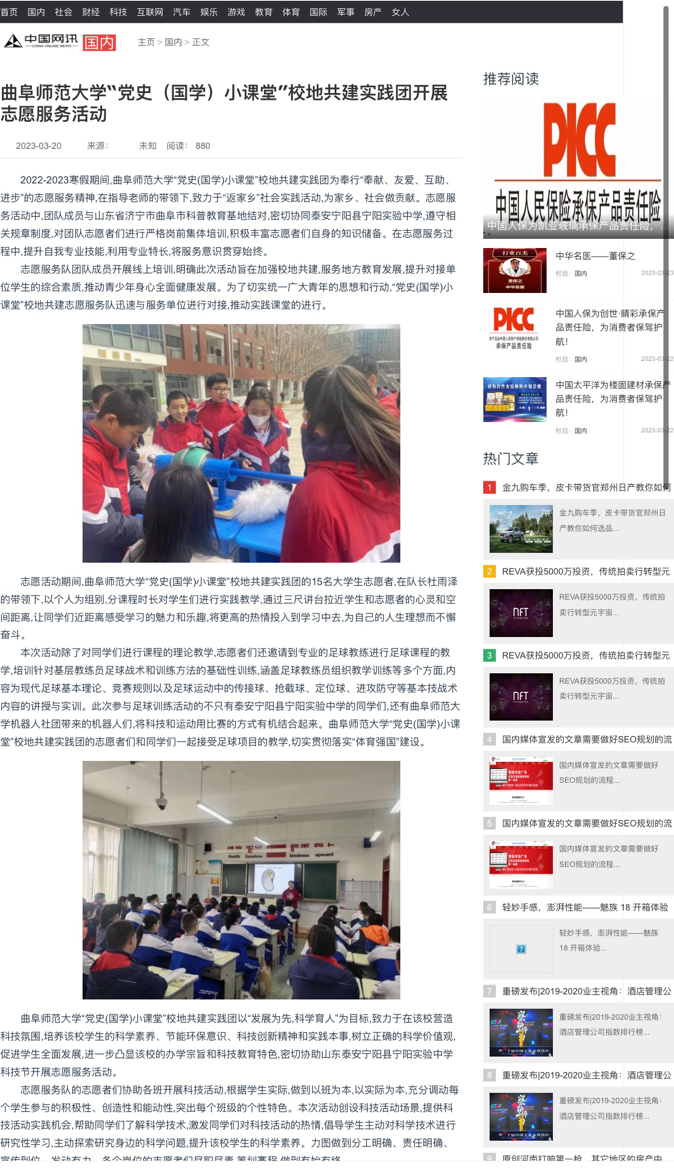 近日,快猫视频 社会实践部在中国网讯发表了“党史(国学)小课堂”校地共建实践团开展志愿服务活动的文章。“党史(国学)小课堂”校地共建实践团奉行“奉献、友爱、互助、进步”的志愿服务精神,在指导老师的带领下, 与山东省济宁市曲阜市科普教育基地结对,在泰安宁阳县宁阳实验中学进行志愿服务活动。
