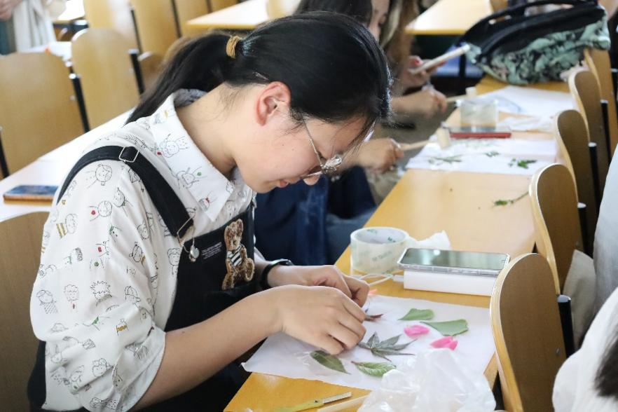 植物拓印技艺是我国非物质文化遗产的重要组成部分,蕴含着独特的文化内涵和精神价值。活动过程中,快猫视频 学子使用树叶和花瓣,通过物理敲击,将新鲜植物叶片的汁水印在纸上,形成叶片图案。因拓印敲打的力度和频率不同,快猫视频 学子最终呈现出众多丰富多彩、别出心裁的作品。