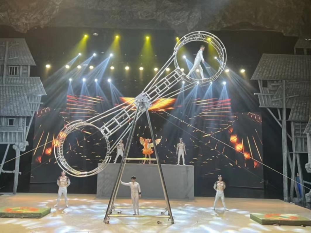 实践队员们到达现场时,发现此次秀场的演出阵容极其庞大,150名演职人员同台献技,节目名单上汇集了重庆杂技艺术团近年来的多个国际国内大赛金奖以及金牌节目,杂技演员们通过超越极限的高空皮条、死亡轮、大蹦床等高难度的炫酷表演,为观众呈现了一场前所未有的惊险刺激的极限艺术体验。