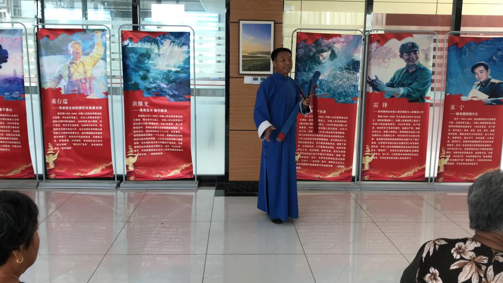 我们再次见到辛老先生是在金乡县新时代文明实践中心,辛老先生正在为“非遗少年”公益培训班教授渔鼓。辛老先生驾轻就熟地唱着,少年班的孩子们倾耳注目地跟着,渔鼓就在这口耳相传中传承下去。在课间我们采访辛老先生是如何接触到渔鼓,并成为了传承人,辛老先生说道:“我自幼就热爱戏曲,上初中时,经常有外来艺人到村里演出,我与同龄人的嬉闹和调皮不同,静静地坐在那里听艺人演唱。高中毕业后,我师父,也就是素有“渔鼓王”之称的高永坤老先生经常来村演出,那时已对戏曲完全痴迷的我下定决心拜师学艺。但是我师父门下已有七名弟子,而我师父招徒原则是一生中只招收八名弟子,所以对招收最后一名弟子的条件要求非常苛刻。我向我师父学习渔鼓的想法提出后,当即遭到了我师父的拒绝。我没有气馁,我三番五次地向师父了解渔鼓的击打手法和要领,并多次偷偷跟着师父在别村演出。最后才终于答应我做他的关门弟子。”说罢,辛老先生拿出一把略显陈旧的渔鼓,这是高永坤老先生在他拜师那天传给他的,希望辛老先生可以让渔鼓代代相传。
