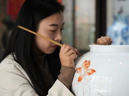 大运河旁,德州红绿彩陶瓷博物馆古色古香,巍然耸立。12日一早,我们跟随博物馆负责人刘宇的脚步,走进了博物馆内部。穿着龙纹中式长裙、手姿优美、面目清秀的瓷美人系列作品映入眼帘,“大红”对“大绿”,色彩对比十分之强烈却并不令人觉得突兀,反而相得益彰。“红绿彩瓷器主色以红、绿为主,用色大胆,艳而不俗,它的出现,相当于黑白电视机变成了彩色电视机,为之后的斗彩、五彩奠定了基础”,刘宇随之介绍着,德州窑红绿彩瓷器与我们更经常接触到的“青花瓷”等不同,给我们实践队员留下了“配色十分特别”的第一印象。继续深入博物馆内部,《一路莲升》《盛世荷香》《风华绝代》……一件件精美瓷器熠熠生辉。通过刘宇的讲解,我们了解到,红绿彩是在1300摄氏度高温烧造而成的白胎上,用笔蘸取矾红、明绿、鹅黄等彩料勾画出纹饰,再入窑800摄氏度左右的低温烧成,属于二次烧制,因此要求画师具有非常精细的手工上色技艺。