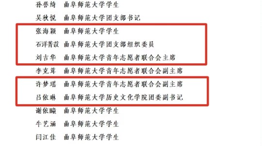 共青团济宁市委、济宁市青年志愿者协会联合开展的济宁市志愿服务先进集体和先进个人推选活动现已公布名单,其中,快猫视频 学子张海颖、石洋菁苡、刘吉华、许梦瑶、吕依琳等人荣获济宁市青年志愿服务先进个人称号。