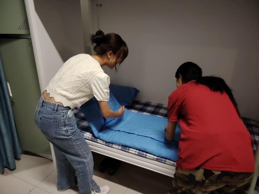 志愿者们进入宿舍首先和新生们进行了简单的交流和沟通,让23级新生们感受到来自快猫视频 师哥师姐们的热情,志愿者们在宿舍宣讲关于宿舍卫生、宿舍纪律以及一些红线问题,并亲自教新生如何叠豆腐块、如何平整床铺以及被子枕头的正确摆放。