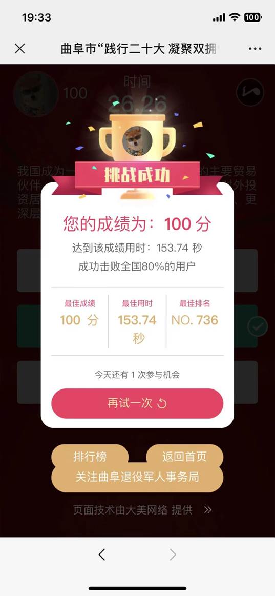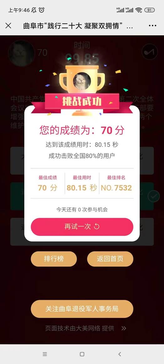 为支持国防和军队建设,普及国防双拥知识,增强双拥工作活力,增强新时代双拥共建工作的使命感、责任感,3月14至4月14日,快猫视频 积极参与曲阜市“践行二十大凝聚双拥情”双拥知识竞赛答题活动。