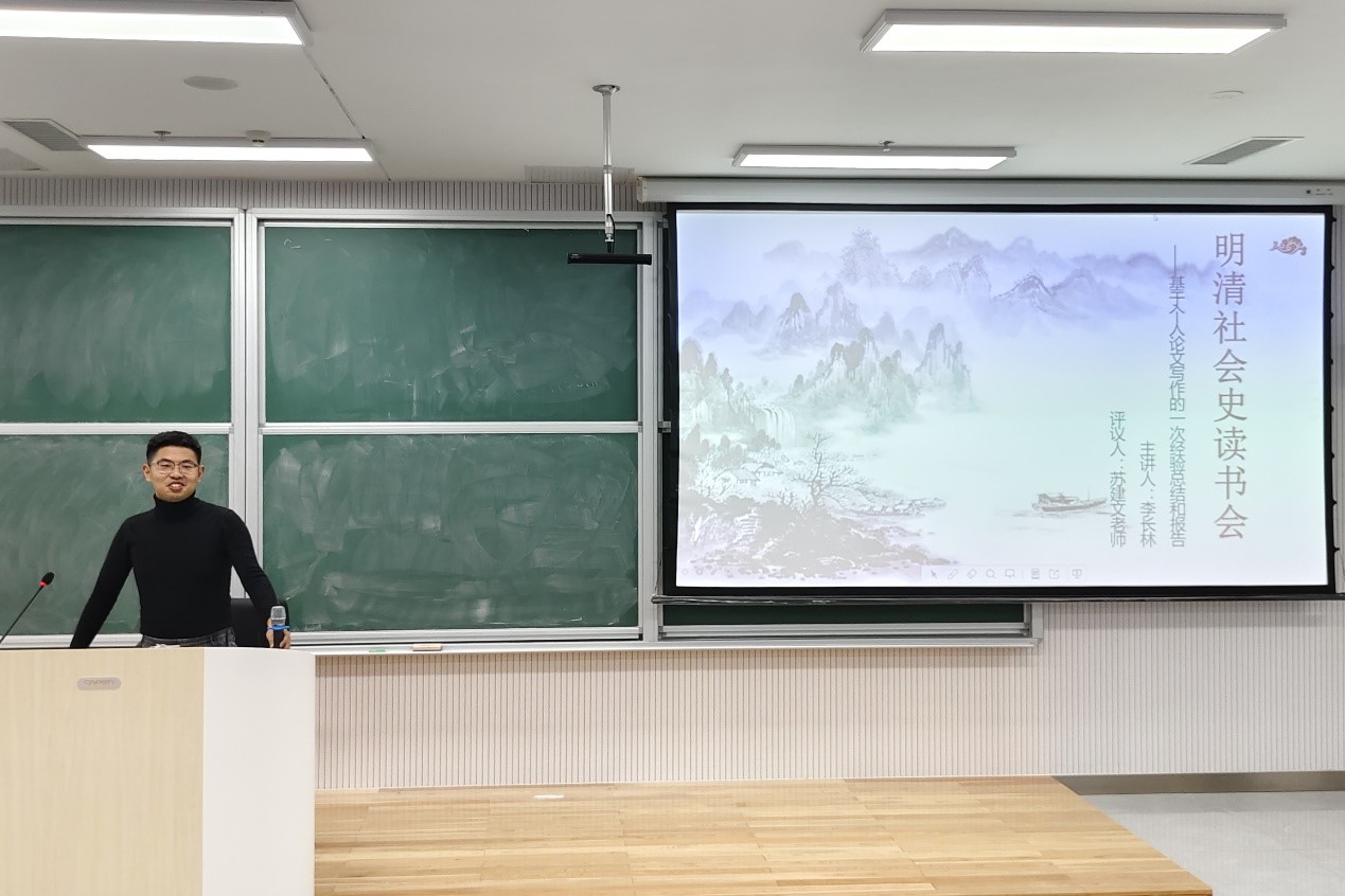 为了进一步拓展学生的历史眼界,增强学生的学术交流能力,快猫视频 《论语》研修学社在苏建文老师的指导下,于2024年11月16日在致知楼B102教室举办了“国学沙龙之明清社会史”读书会,由牟洋同学主持。