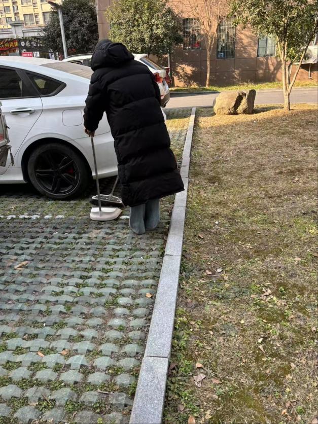 有的实践队员来到绿化带和旁边的停车位上清扫垃圾,不放过任何一个角落。在清扫绿化带时,队员们轻轻地拨开绿植枝叶,用夹子夹起隐藏其中的废纸、包装袋。一位实践队员发现绿植深处有一团塑料膜,为避免损伤绿植,他侧身探入,稳稳地用夹子将垃圾夹出。清理落叶时,队员们用耙子将其聚拢起来,再用袋子装好,整个过程细致入微,尽力呵护每一株植物。在清扫停车位时,队员们手持扫帚与拖把,有条不紊地清理,将角落里和车底座下面的灰尘、烟头和杂物都仔细扫出,在遇到难以清扫的口香糖等黏在地面上的东西时,实践队员们蹲下,用小铲子耐心铲除,直至地面恢复洁净。阳光下,他们的身影忙碌而有序,为社区的整洁与美观默默奉献着。他们的行动不仅美化了社区环境,也展现了实践队员们良好的社会责任感和团队协作精神。路过的居民纷纷投来赞许的目光,有的还停下脚步,与实践队员们亲切交谈,对他们的辛勤付出表示感谢。