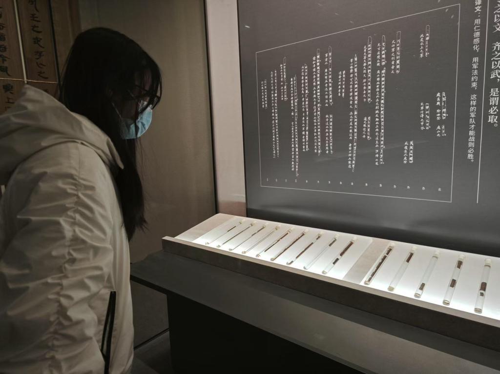 当队员们踏入银雀山汉墓竹简博物馆的那一刻,仿佛穿越时空,进入了一个承载着千年历史的文化殿堂。馆内陈列的众多珍贵文物中,最引人注目的当属银雀山汉墓竹简。队员们参观到了出土于1972年的竹简,除此之外,更是通过虚化投影、情景演绎等现代科技手段体验了故事发生的始末,更深入的了解了《孙子兵法》等先秦典籍所蕴含的军事文化思想。在参观途中,队员们这么说:“在博物馆里看见了许多之前未曾见过的古迹残片,这种具体的存在加强了我们与古人之间的联系,也为当下提供了更多的建议。”