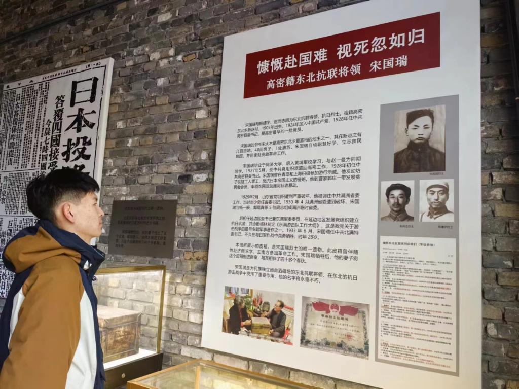 在追寻文学脉络的同时,实践队不忘探寻高密的红色历史,缅怀英雄宋国瑞烈士。队员们来到宋国瑞烈士纪念馆,馆内陈列的珍贵文物和历史资料,生动地展现了烈士的英勇事迹。宋国瑞出生于高密,在革命年代,他积极投身反帝反封建斗争,为了民族独立和人民解放事业,不惜抛头颅、洒热血。1927年,他参与领导了高密的农民武装起义,虽最终起义失败,但他的英勇行为激励了无数后来人。