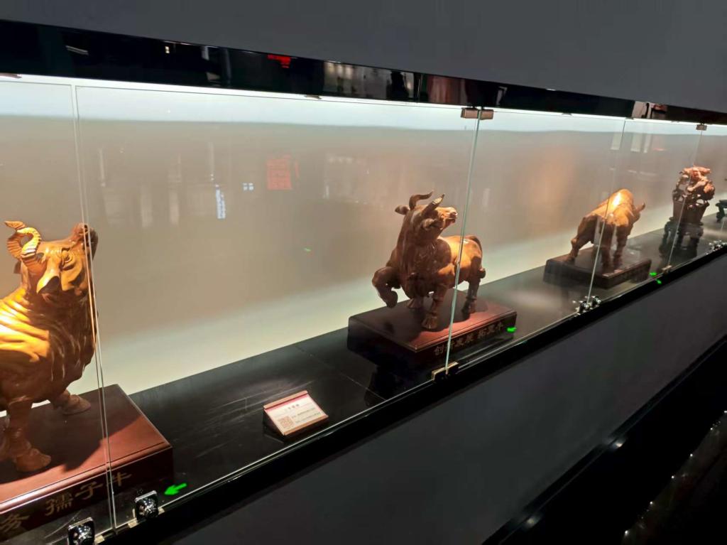 玻璃展柜里的“孺子牛”“拓荒牛”雕刻,将目光引向时代命题。桃木棕的肌理中,牛的姿态刚劲有力,底座“三牛精神”的铭文与古老材质碰撞出火花。“老木料雕出新精神,这就是传承的破圈!”围绕展柜的讨论中,队员们达成共识:文化传承不是复刻标本,而是让古老载体成为时代精神的容器——如这些雕刻,在桃木纹路里生长出当代精神注解。